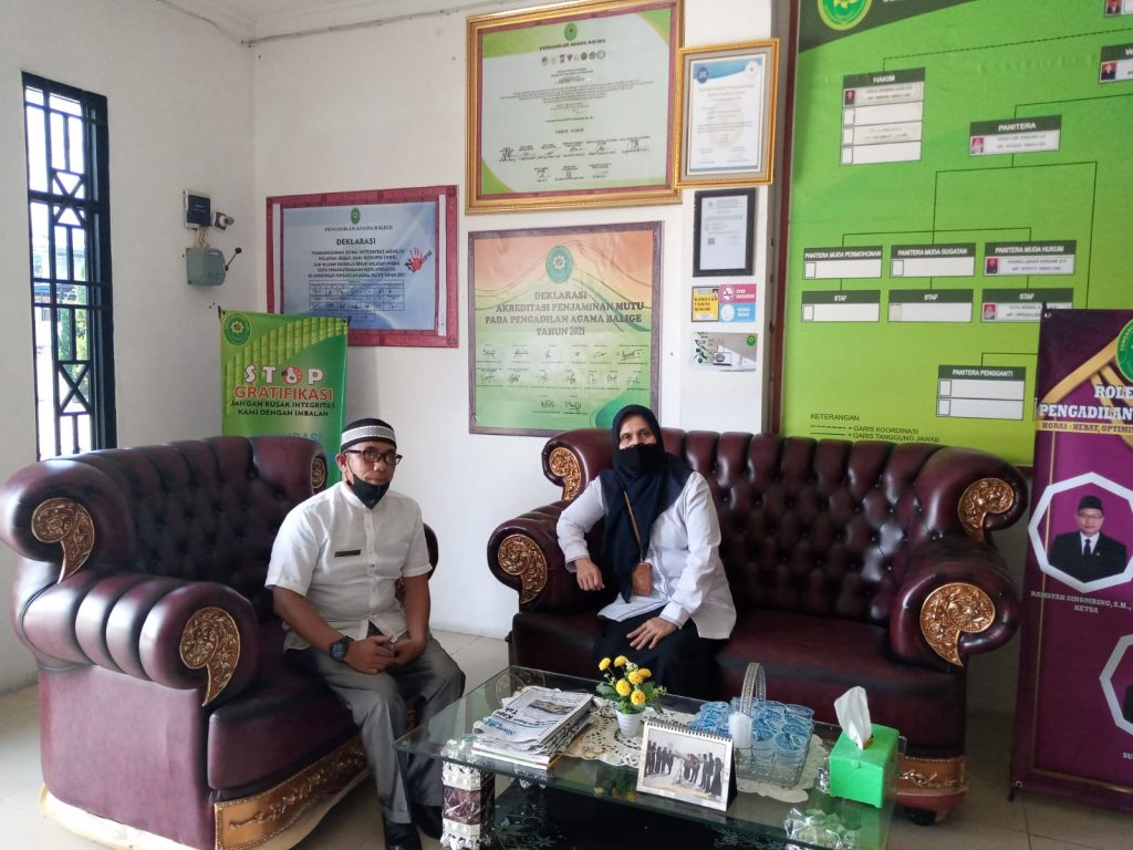 Balige (09/11/2021) : Selasa Pagi Panitera Pengadilan Agama Balige Melakukan Koordinasi Dengan Kepala KUA Kecamatan Balige. Koordinasi yang dilakukan Sriwati Br. Siregar, S.H., selaku Panitera Pengadilan Agama Balige ini dengan tujuan melakukan pengumpulan data awal masyarakat-masyarakat muslim yang memiliki kondisi ekonomi kurang dan terpinggirkan di Kabupaten Toba. Nantinya masyarakat-masyarakat muslim yang memiliki tingkat ekonomi lemah dan belum memiliki identitas hukum perihal perkawinan ataupun keadaan anak-anaknya, akan digiring menuju pendaftaran perkara secara gratis melalui prodeo dan posbakum pada tahun 2022 mendatang.
