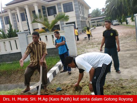 Panitera PA Kisaran (Drs. H. Alpon Khoir, SH, MH) menyampaikan bahwa gotong royong kali ini disamping melakukan pembersihan halaman gedung kantor, juga dilakukan pembersihan di luar pagar gedung kantor bagian depan, yaitu membersihkan rumput dan membuka kembali pintu pagar sebelah selatan bagian depan. Hal ini penting dilakukan karena selama pagar tersebut kita tutup selama ini, maka banyak truk-truk besar yang parkir di panggir jalan depan kantor sehingga mengakibatkan situasi kantor kurang nyaman. Dengan berfungsinya kembali kedua pintu tersebut maka pintu masuk melalui pintu sebelah selatan (depan) dan keluar melalui pintu sebelah utara (depan). Selain itu diharapkan mobil-mobil truk juga tidak akan lagi melakukan parkir di pinggir jalan depan gedung kantor Pengadilan Agama Kisaran.