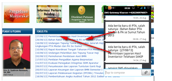 Tampilan fokus PTA di pta-medan.go.id dan tampilan SMS yang diterima operator
