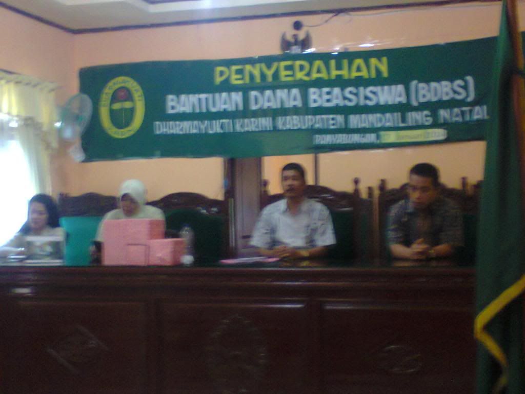 Penyerahan dana BDBS ini langsung di serahkan Ibu wakil ketua I dan wakil ketau II di damping oleh pelindung Ketua Pengadilan Agama Panyabungan dan wakil ketua Pengadilan Negeri Mandailing Natal dengan jumlah yang menerima 14 orang.