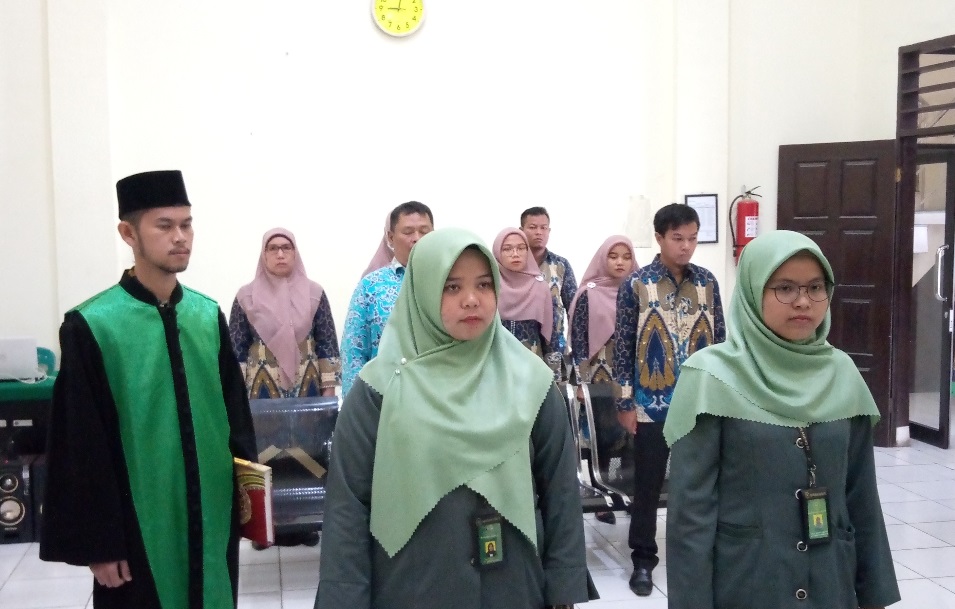 Segenap aparatur di Pengadilan Agama (PA) Kota Padang Sidempuan berkumpul di ruang sidang tepat pada pukul 08.30 WIB untuk menggelar acara pelantikan dan pengambilan sumpah jabatan fungsional bagi 2 (dua) Pegawai Negeri Sipil atas nama sdri. Rina Rahmadini, S.T. sebagai Pranata Komputer Ahli Pertama dan sdri. Zelly Kurnia, A.Md.A.B sebagai Arsiparis Terampil/Pelaksana Pengadilan Agama Kota Padang Sidempuan, pada Rabu, 31 Agustus 2022.